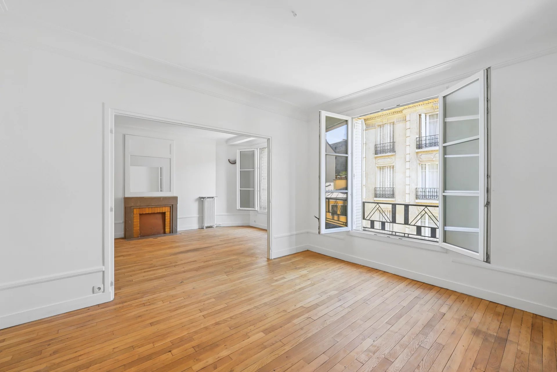 Located in a quiet, residential environment close to all amenities, it comprises an entrance hall leading to a double reception room (31 m²) facing west, a separate kitchen, a bedroom on the street side, a bedroom on the courtyard side, a bathroom separating the two bedrooms and a separate toilet.