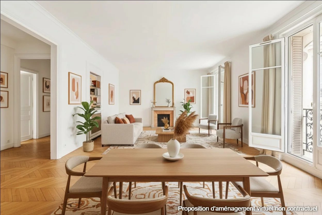 Close to rue de Passy and avenue Mozart, this beautiful 140m² family apartment enjoys the calm of a small, leafy street. Located on the raised second floor of a building dating from 1900, it is particularly attractive for its brightness and optimized layout.
