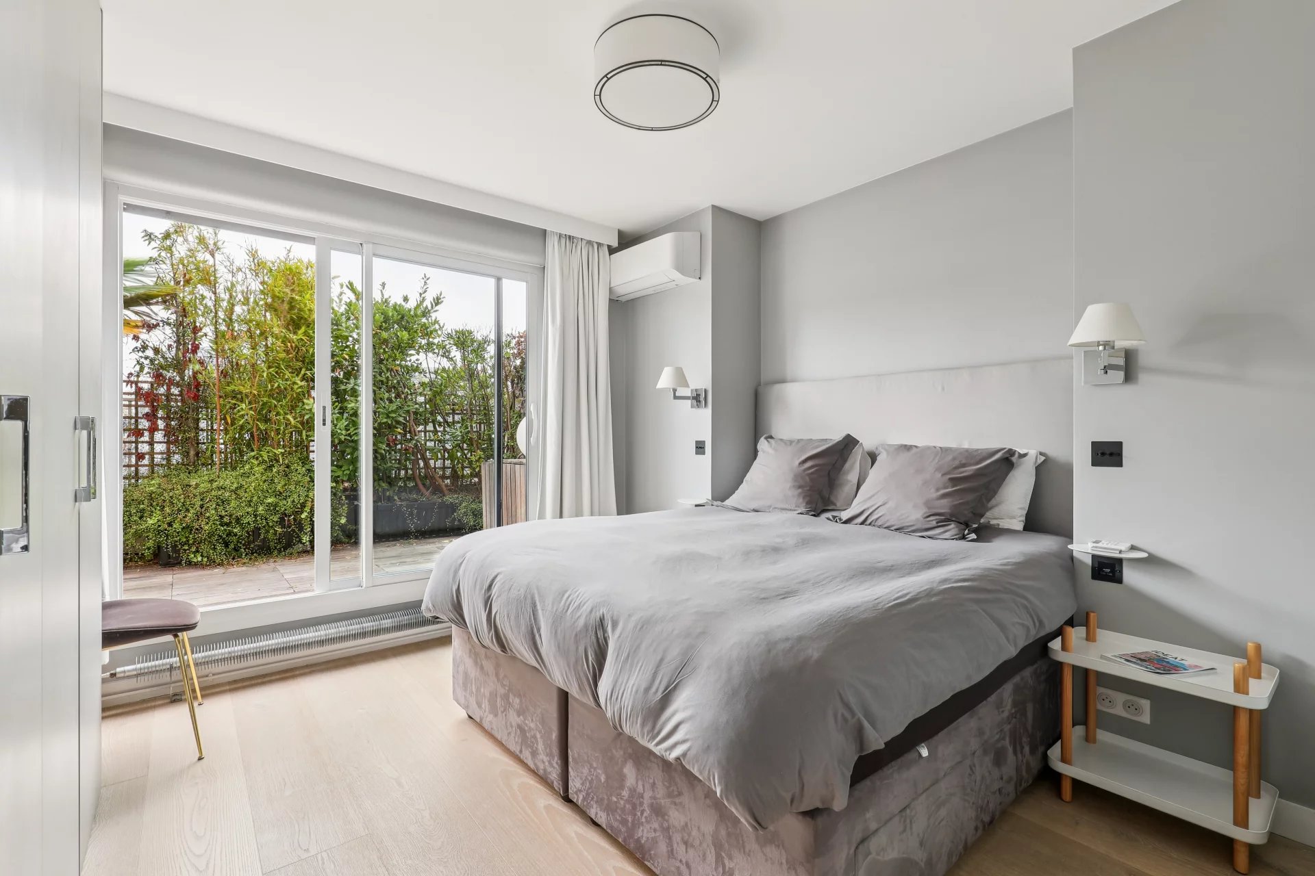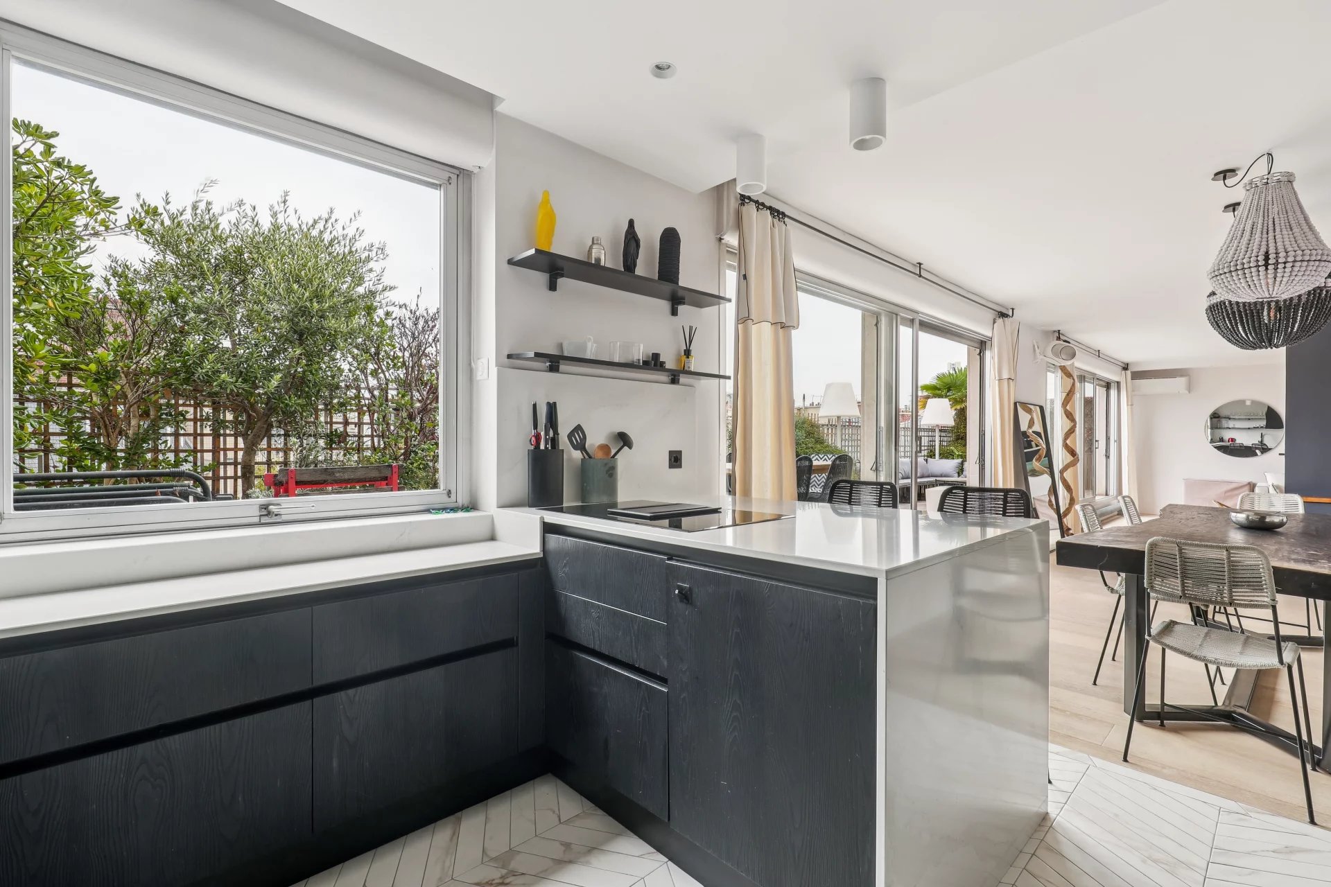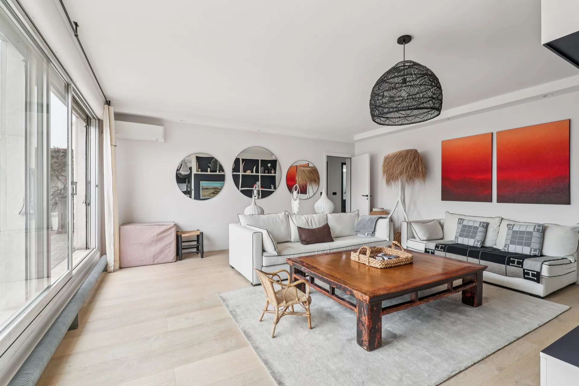 This bright apartment comprises an entrance hall with closet, a living room opening onto a 45 m² south-facing terrace, an open-plan kitchen and dining room, a master bedroom with dressing room, a second bedroom with dressing room, a bathroom, several closets, and a separate toilet. A cellar completes this property.