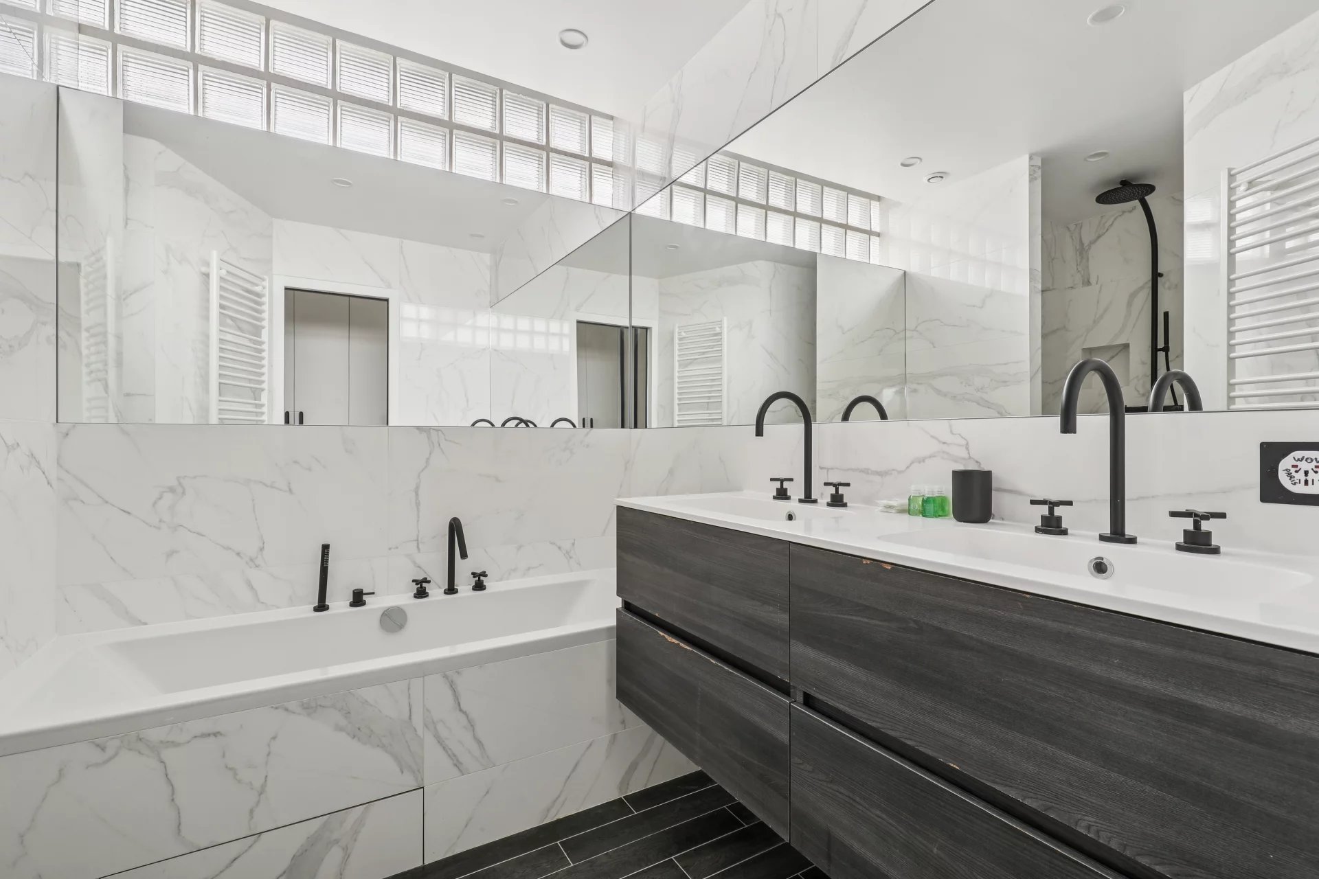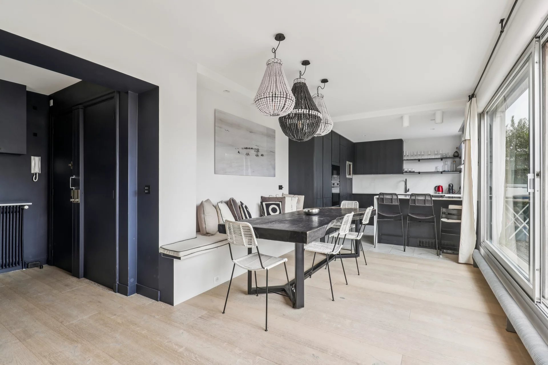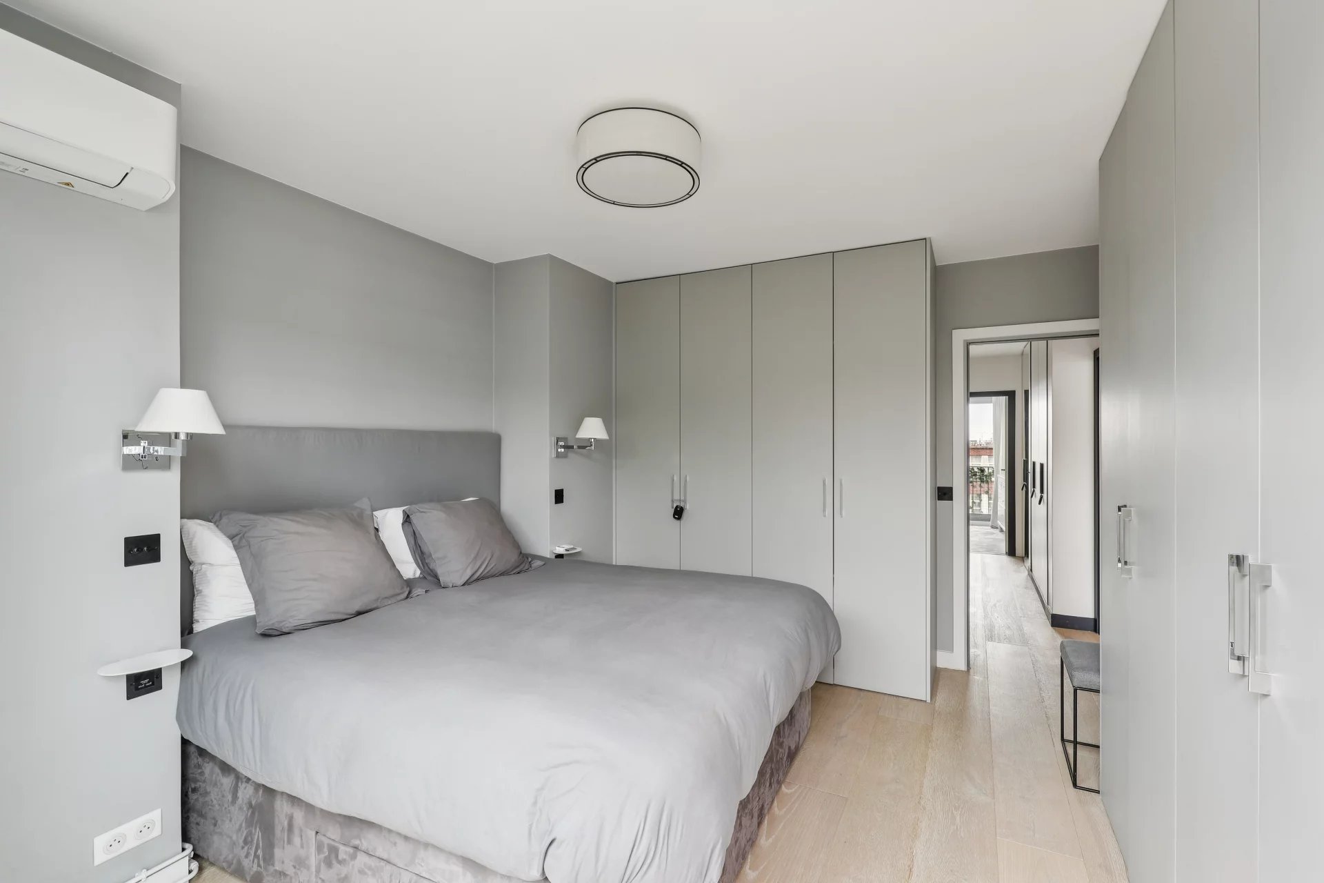 This bright apartment comprises an entrance hall with closet, a living room opening onto a 45 m² south-facing terrace, an open-plan kitchen and dining room, a master bedroom with dressing room, a second bedroom with dressing room, a bathroom, several closets, and a separate toilet. A cellar completes this property.