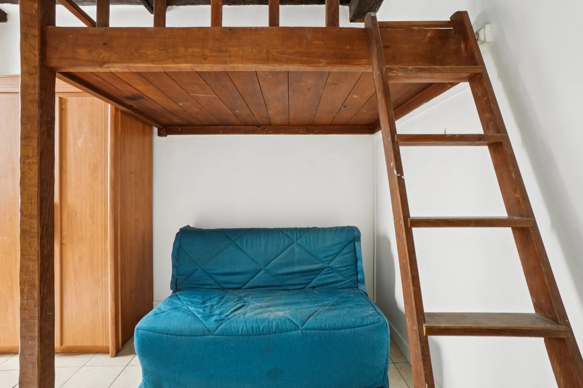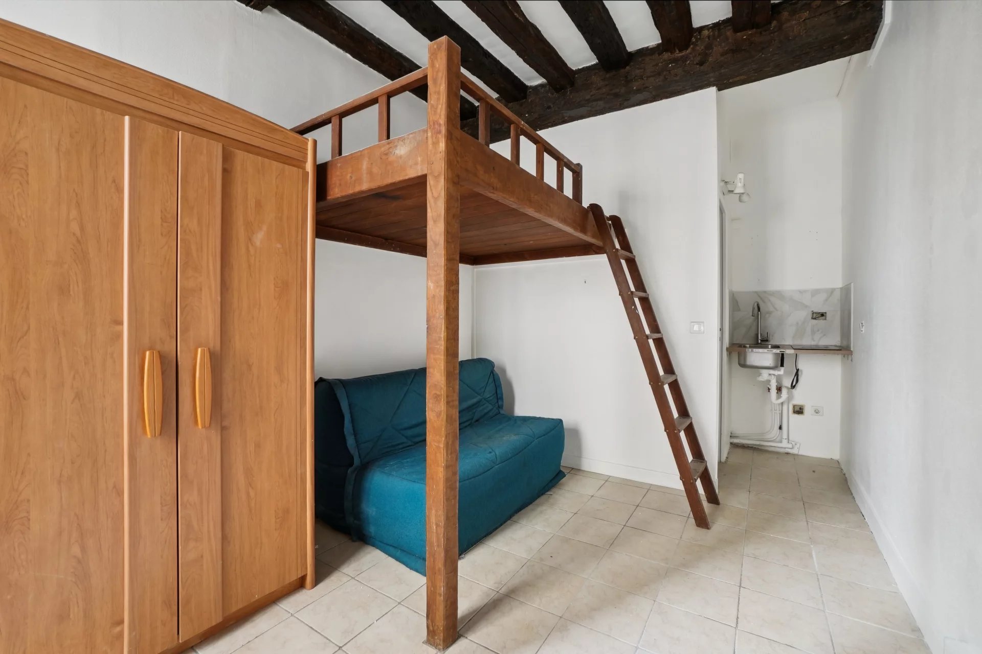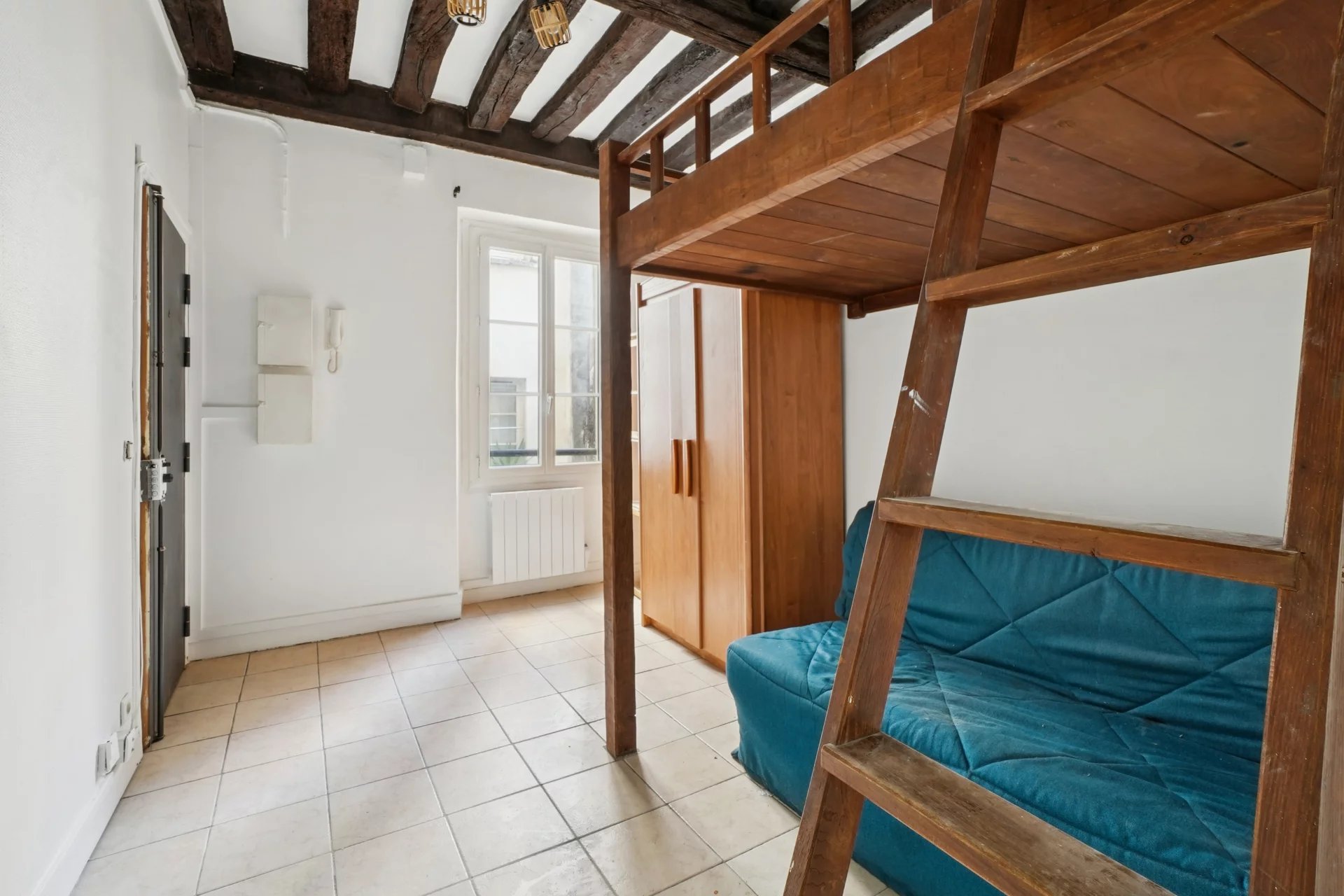 In the heart of the historic Marais district, on rue des Rosiers, in an old building dating from the mid-17th century, the group offers a charming studio with 2.90m² high ceilings and exposed beams. It comprises a living room with mezzanine, a kitchenette and a shower room with toilet. Quiet and bright, this property is in very good condition.