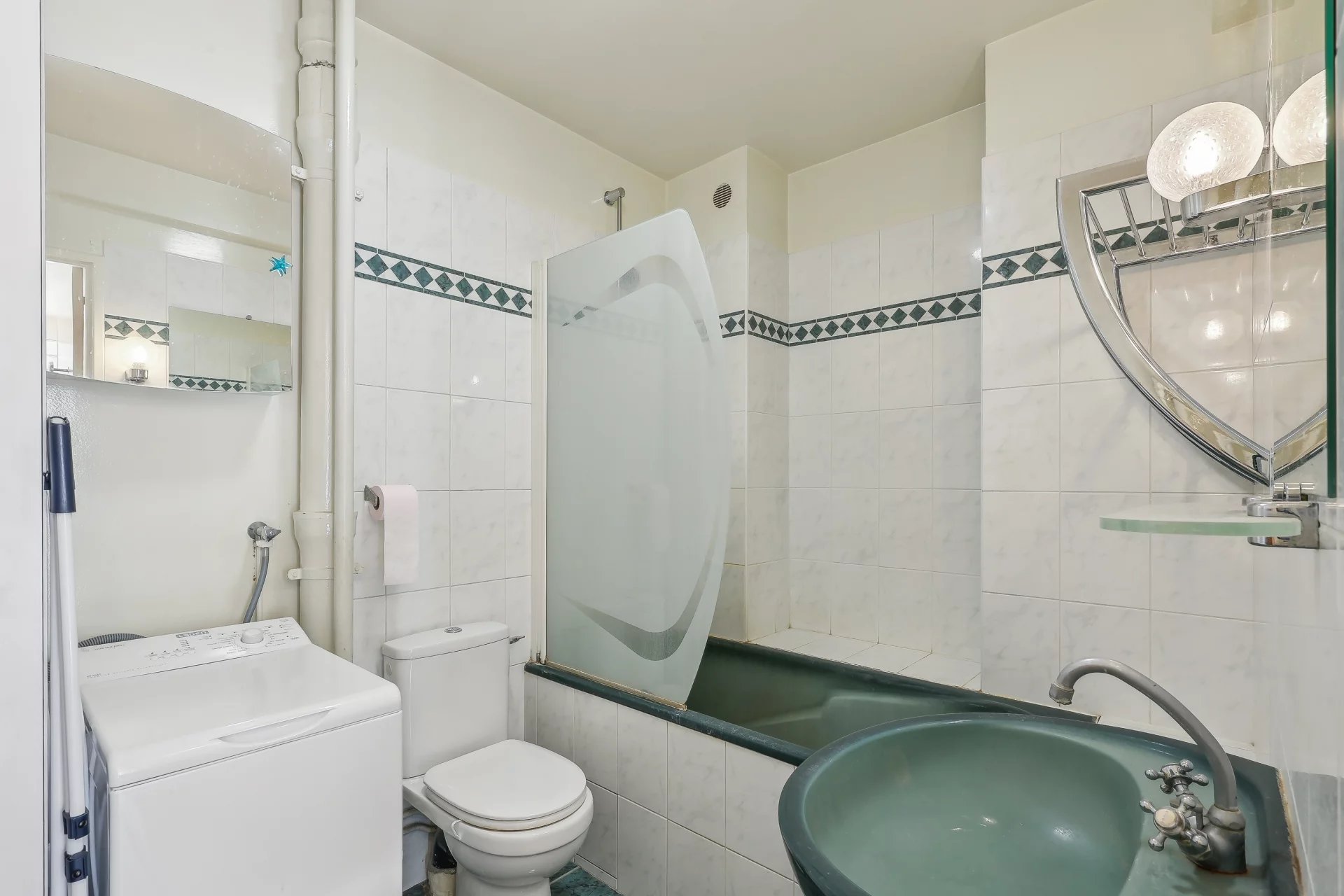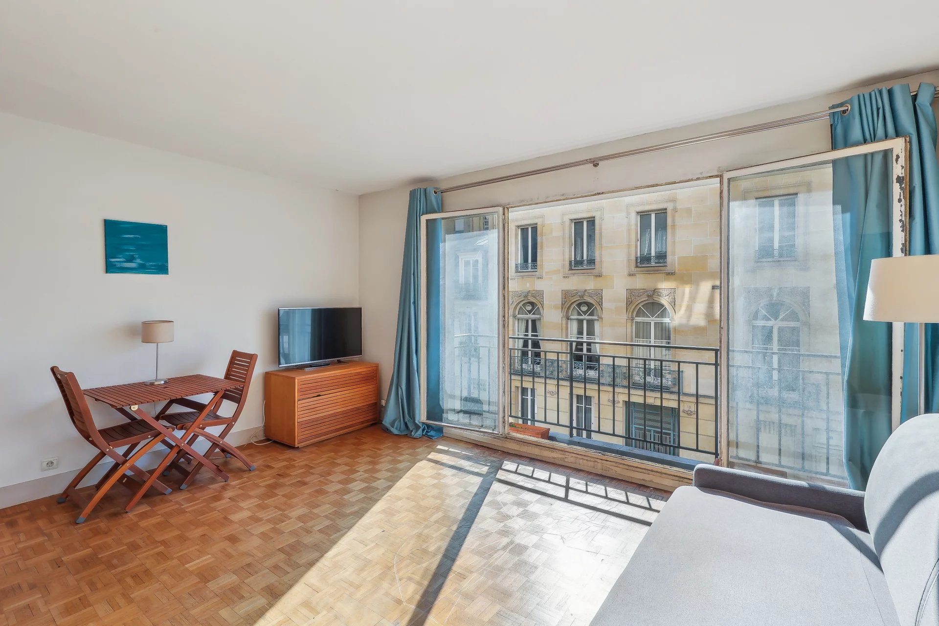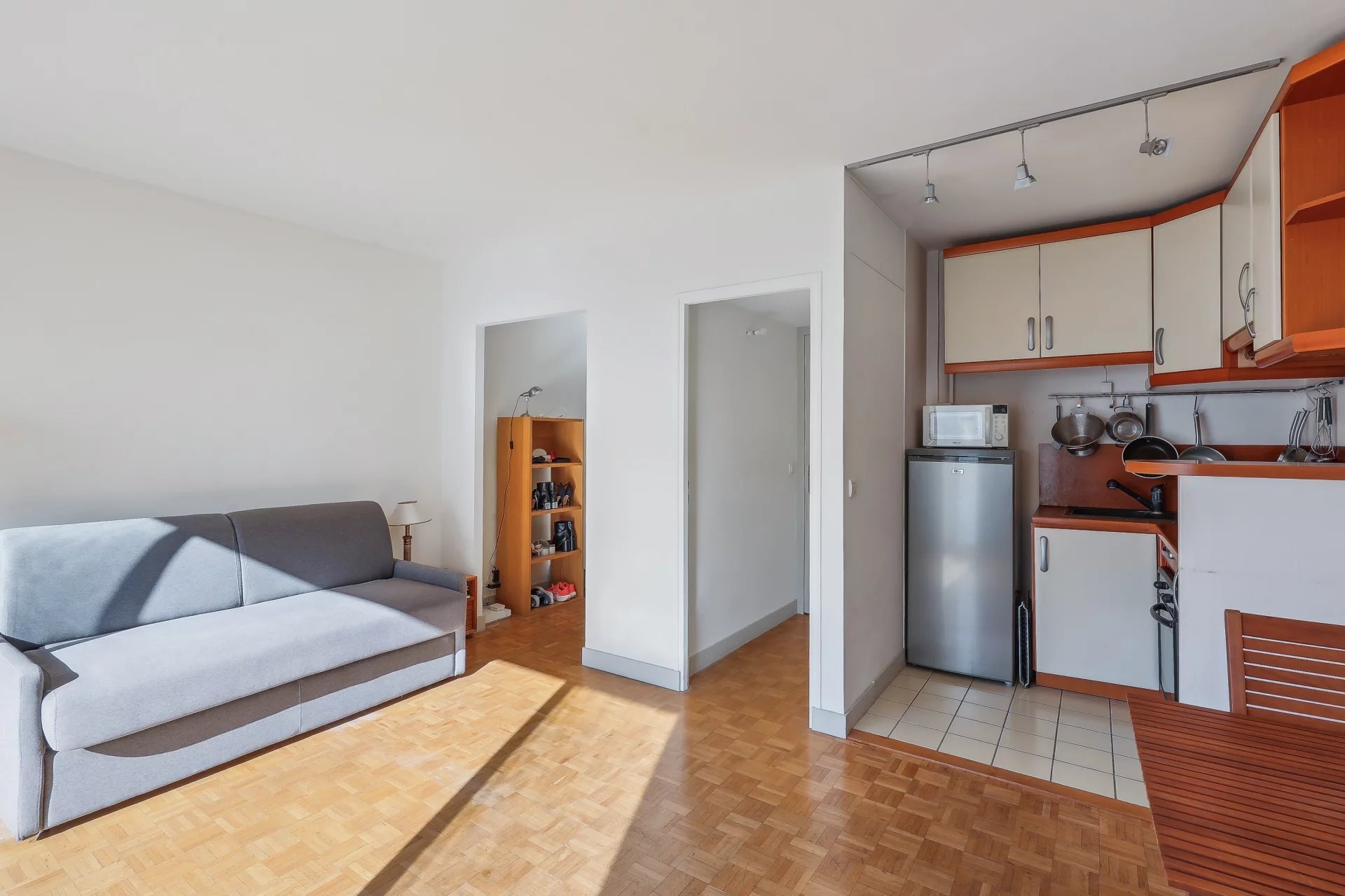 Overlooking the Invalides, on the 2nd floor with elevator of a luxury 1960 building, sqm28.83 studio - Functional layout with entrance closet, main room with bay window opening onto a south-facing balcony, fully-equipped kitchen and shower room with toilet - Cellar.