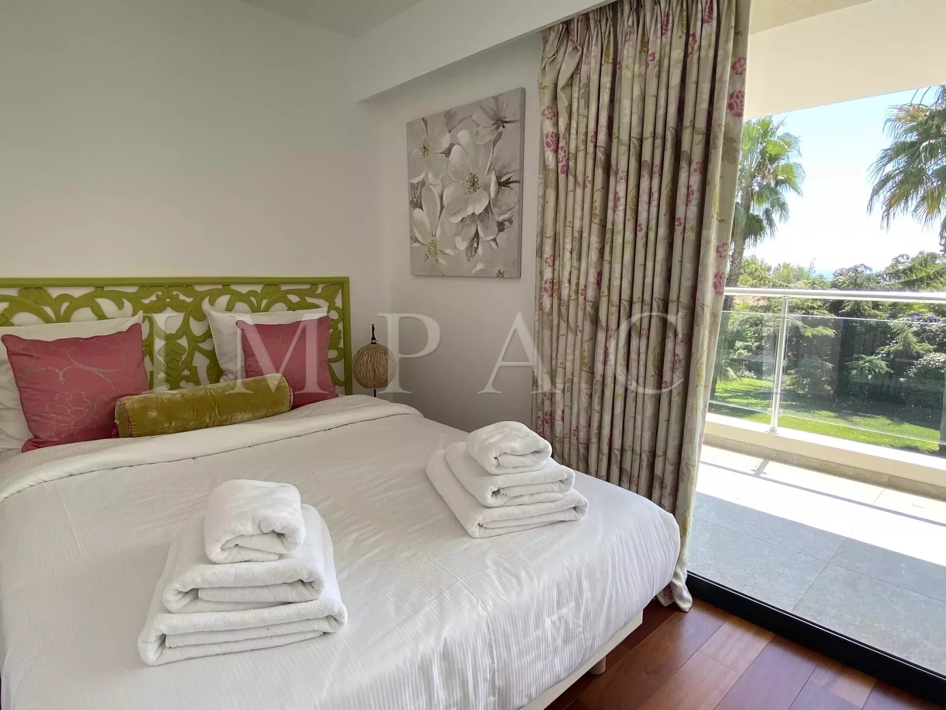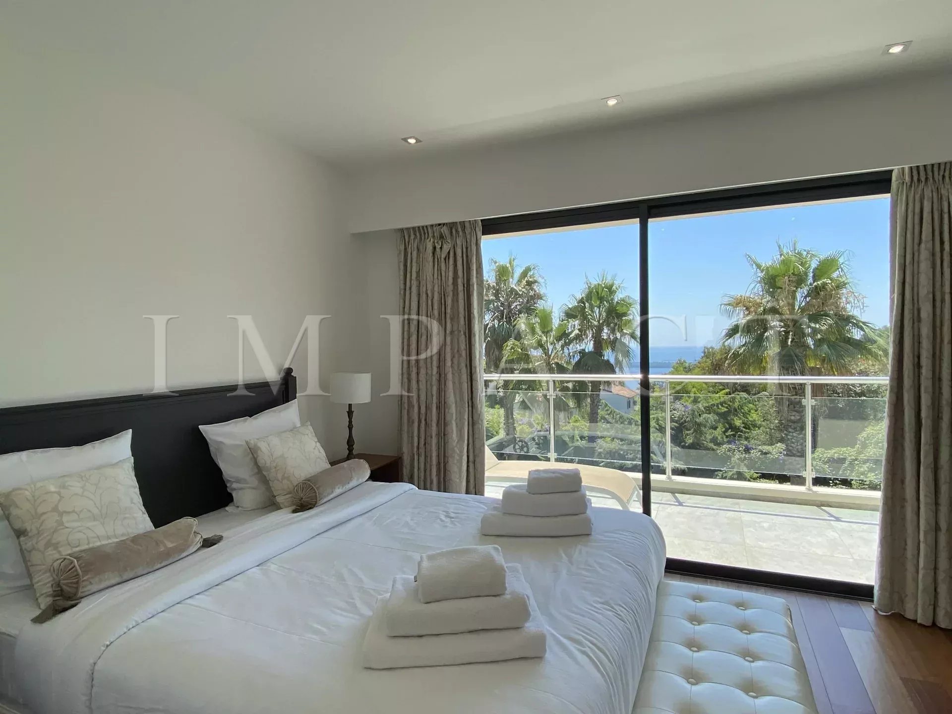 Located in a residential area and built on a plot of more than 2100m², renovated villa in contemporary style with high quality materials, facing south offering a surface area of approximately 220sqm (Loi Carrez:202sqm), with more than 500sqm terraces enjoying a magnificent view of the Lérins Islands.