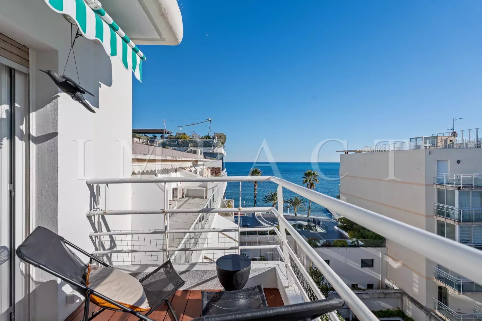 Appartement idéalement situé à Cannes, offrant une jolie terrasse de 10m² ensoleillée avec vue directe sur la Méditerranée, aménagée pour vos petits-déjeuners face à la mer.