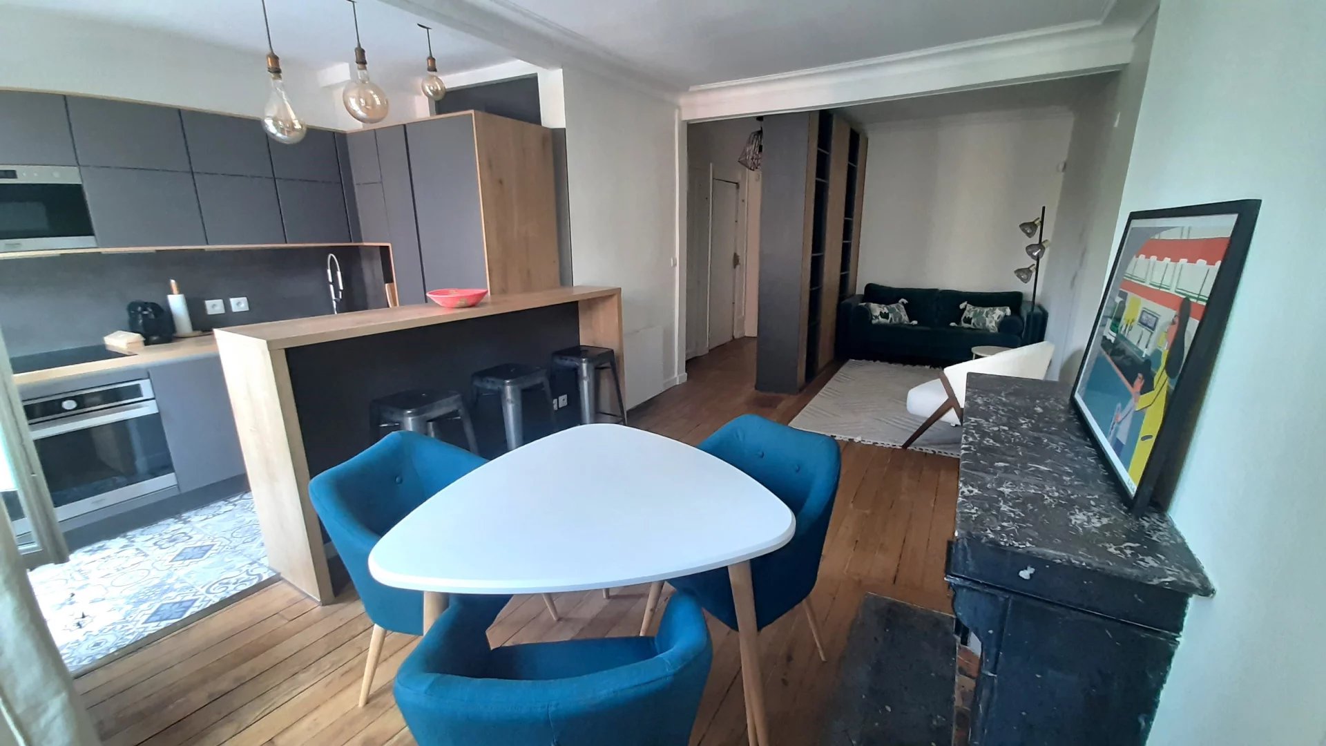 Rue de Vaugirard, au pied du métro Vaugirard (Ligne 12), au 3ème étage SANS ASCENSEUR, un charmant MEUBLÉ de 52,40m² composé de : entrée, séjour, salle à manger, cuisine/bar aménagée équipée et ouverte, chambre parentale de 11,76m² avec en enfilade une pièce de 9m² qui peut servir de bureau/dressing/chambre bébé avec rangements/penderie intégrés, salle de douche italienne avec WC sanibroyeur. Parfait état général, charme de l'ancien, au pied du métro "Vaugirard", des bus et des commerces. Pas de cave.