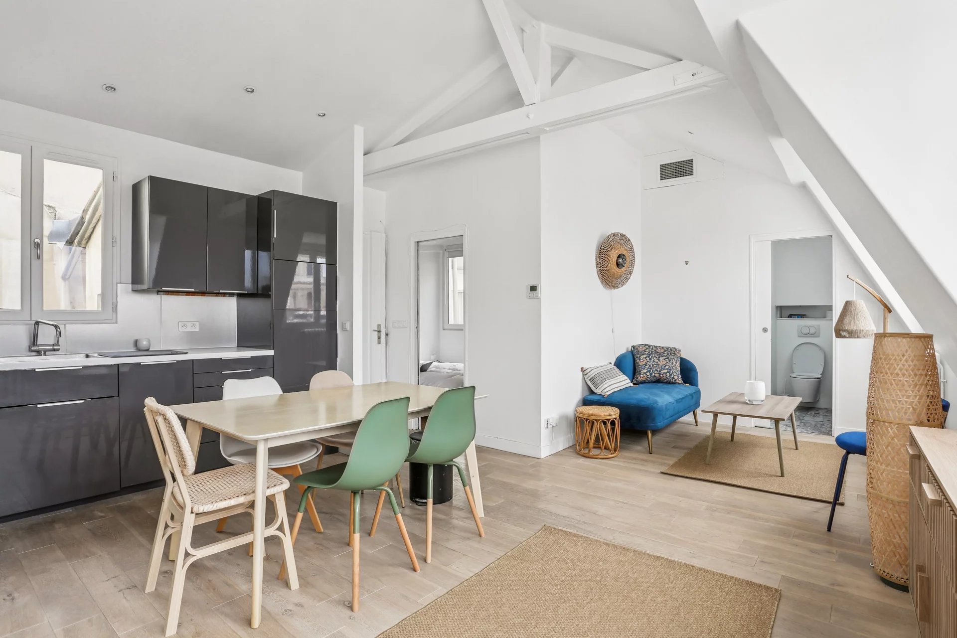 Au sixième et dernier étage d'un immeuble ancien (sans ascenseur), charmant appartement de deux pièces, entièrement refait à neuf, comprenant : Une pièce principale avec coin cuisine aménagée et équipée offrant une magnifique vue dégagée sur la tour Eiffel et sur l'Eglise Saint Sulpice, une chambre et une salle de douche sur cour, ainsi qu'un WC séparé avec un petit coin buanderie équipé d'un lave-linge/ sèche-linge combiné.