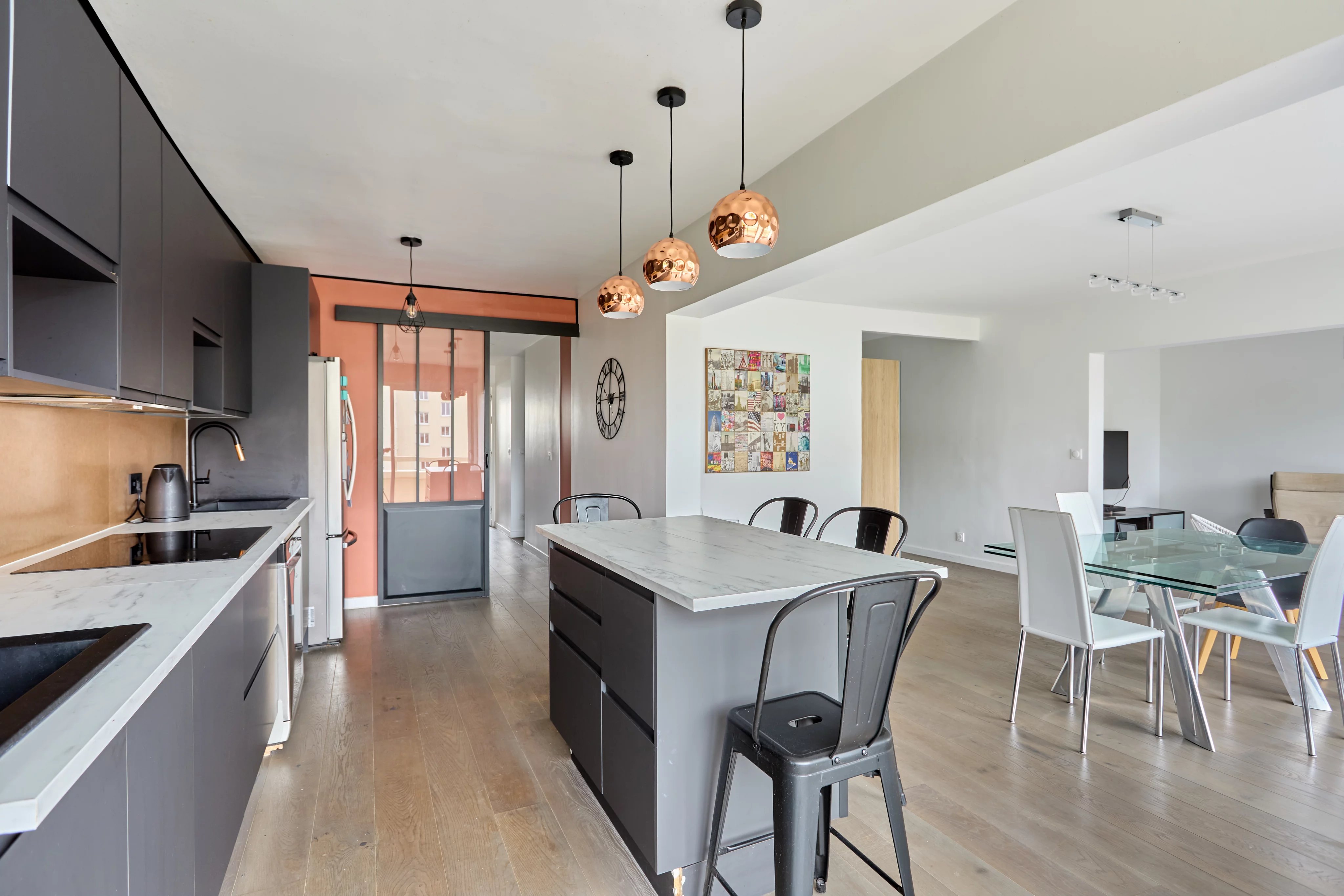 Boulogne Billancourt - Secteur Albert Kahn. A deux minutes de la ligne 10, situé au 5è étage avec ascenseur d’une copropriété semi-récente, découvrez cet appartement familial d'une surface de 107,4 m² Carrez, alliant confort moderne et sérénité absolue. Sa pièce de vie est magistrale. D'une surface de 55m², elle se compose d'une cuisine ouverte entièrement aménagée et équipée et d'un double séjour qui s'ouvre sur un balcon de 15m² au calme et sans vis à vis. Grâce à son exposition Sud, la luminosité est omniprésente tout au long de la journée.
