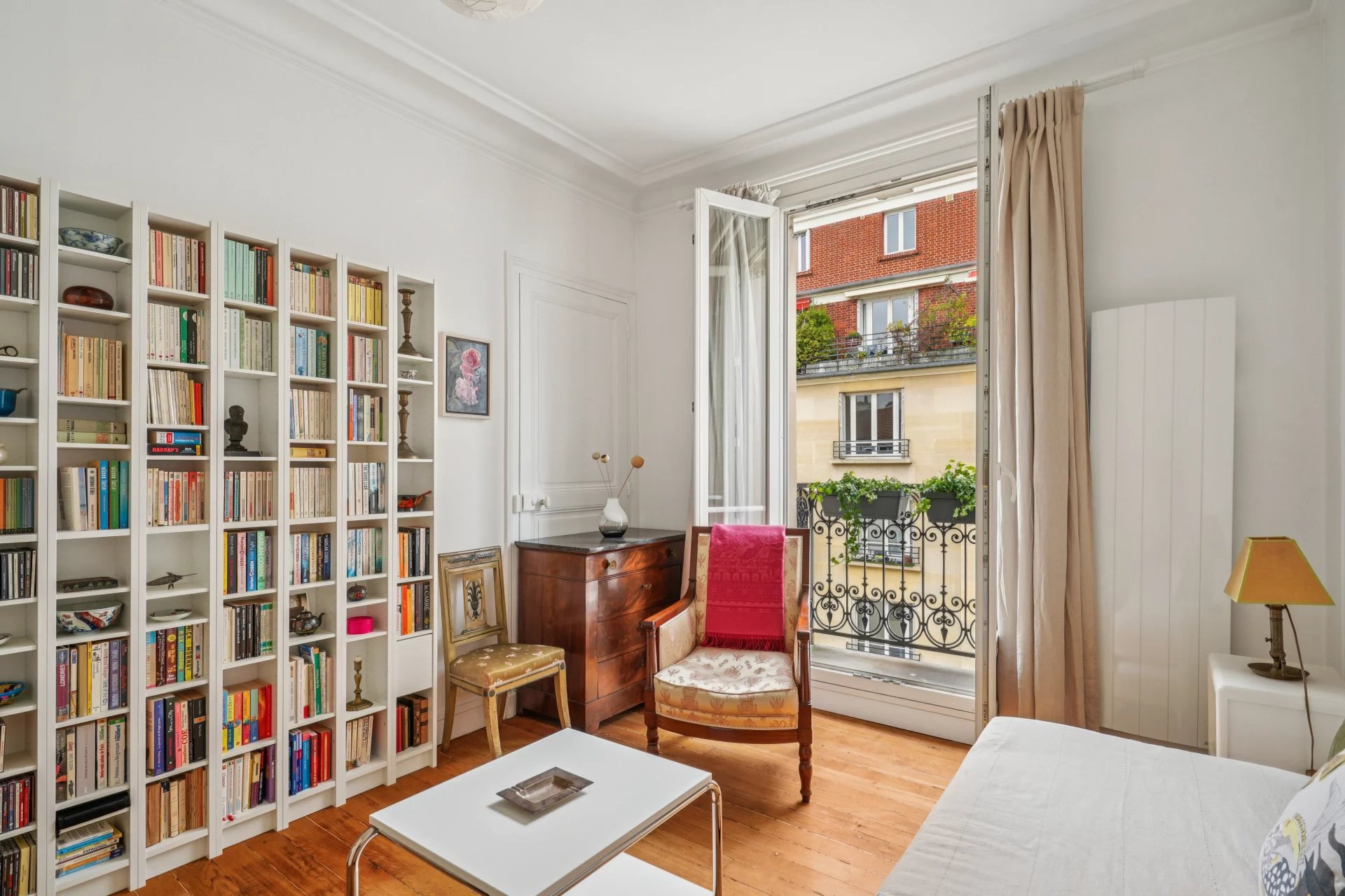 Le séjour ainsi que les deux chambres s’ouvrent chacune sur un petit balcon offrant une vue dégagée sur la Tour Eiffel.