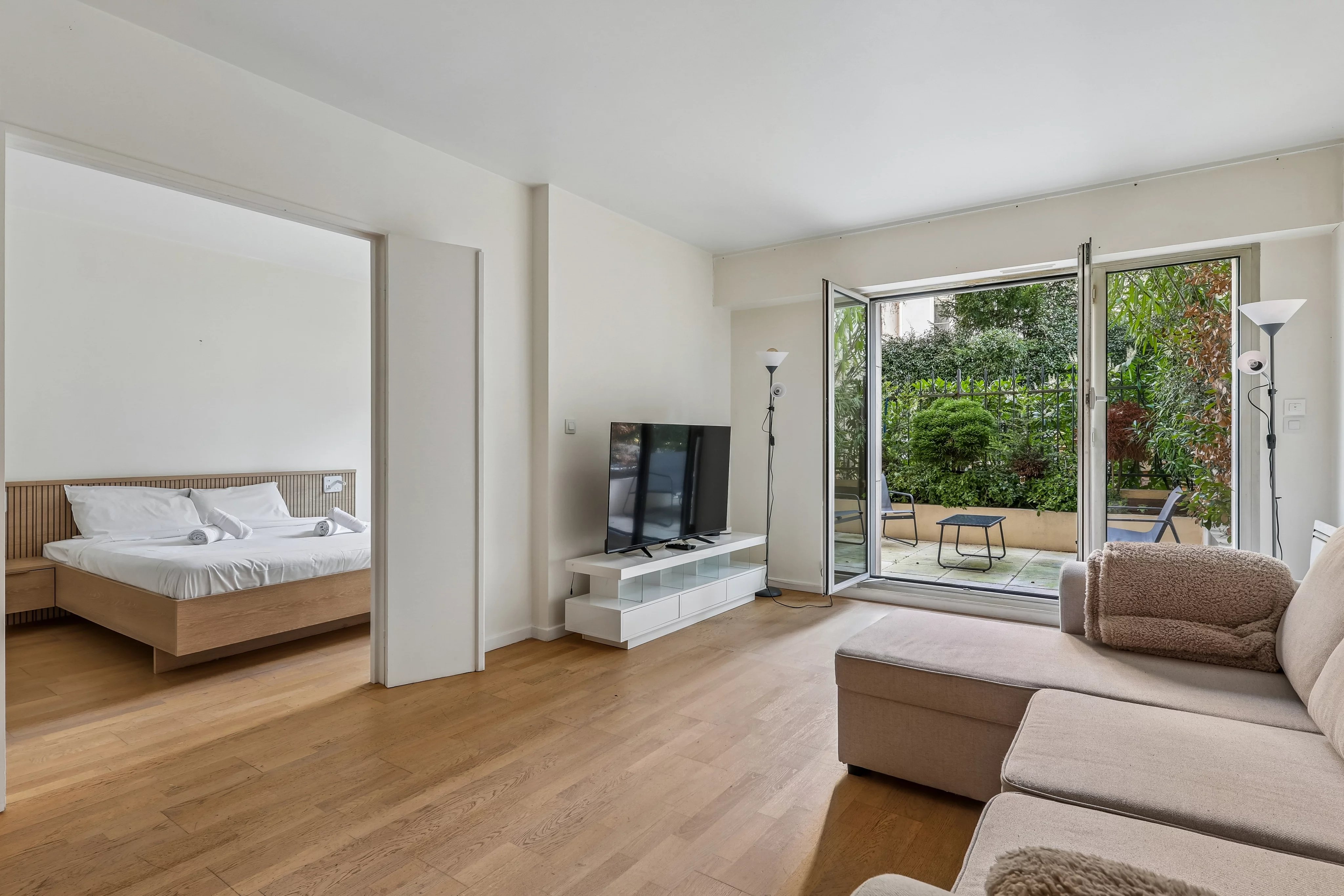 L’appartement se compose d’une entrée, de toilettes invités, ainsi que d’une cuisine équipée et aménagée semi-ouverte, donnant sur un séjour lumineux prolongé par une agréable terrasse de 21 m².