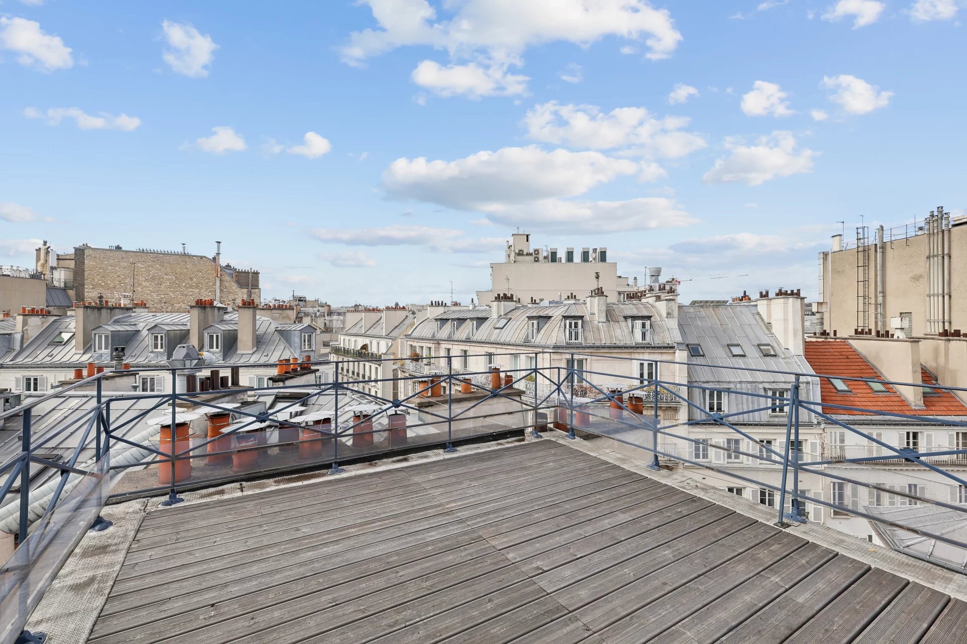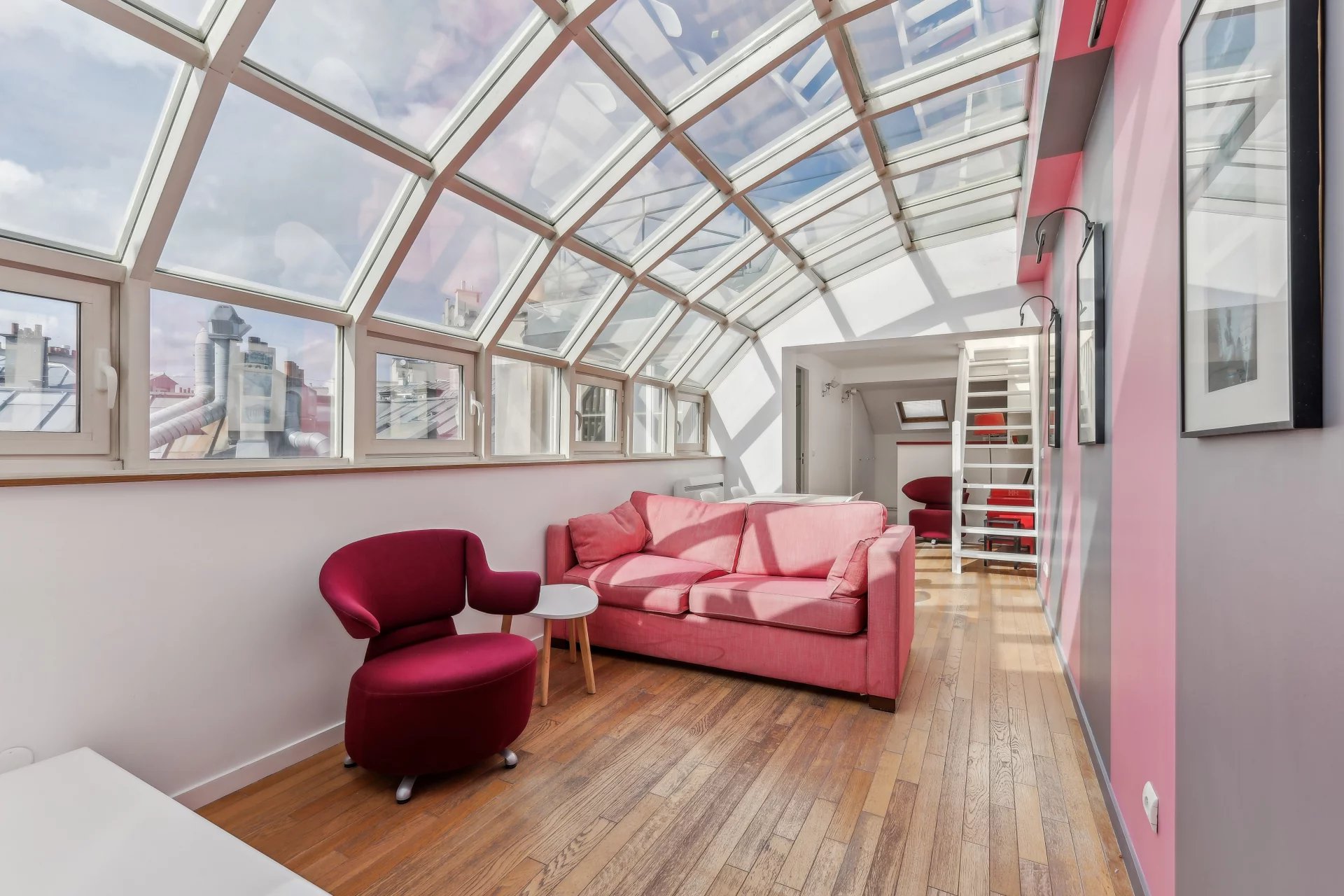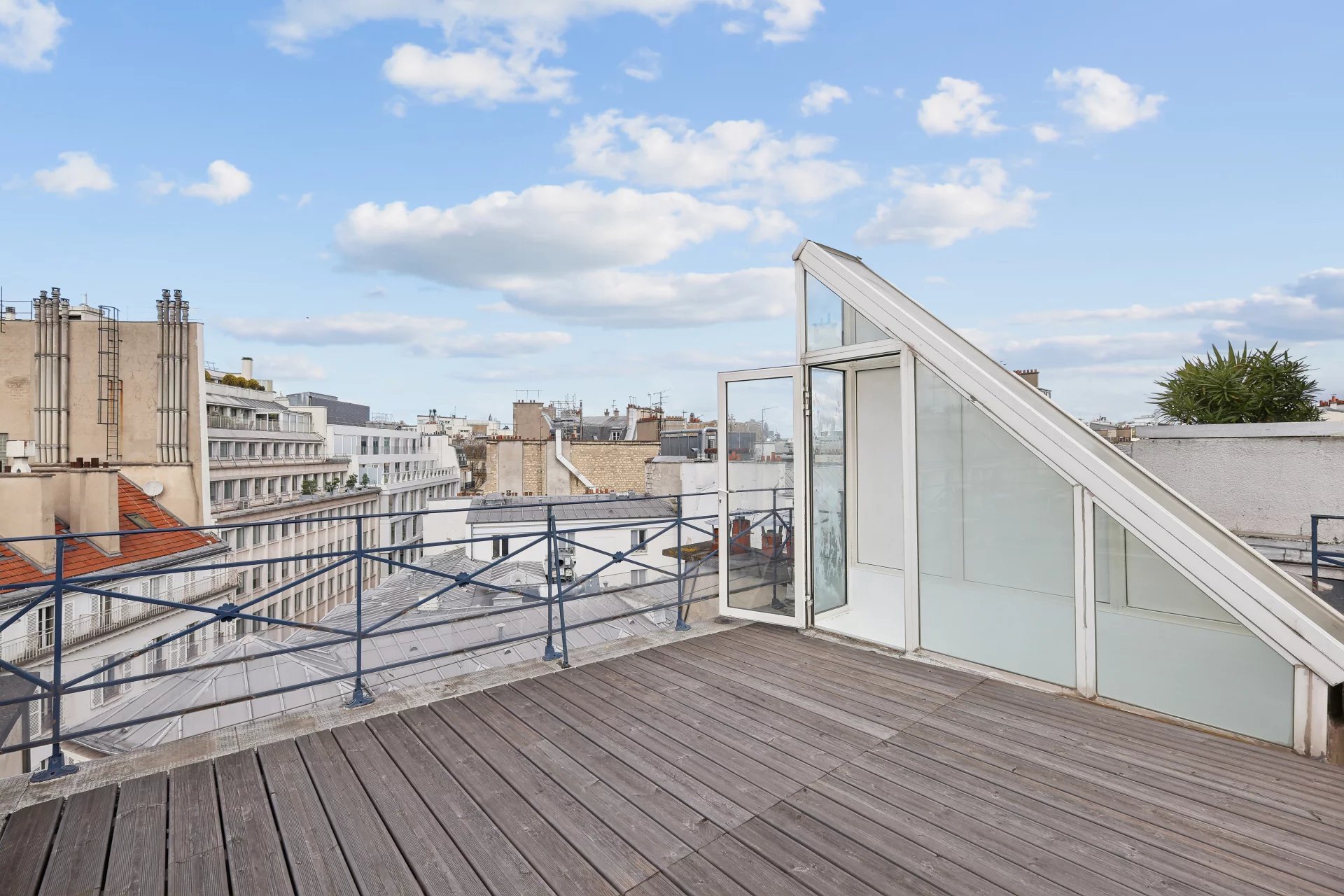 Situé au dernier étage avec ascenseur d'un bel immeuble datant des années 1900, le groupe VANEAU vous présente ce superbe duplex atypique comprenant une entrée, une pièce de vie avec verrière exposé sud ouest, s'ouvrant sur une cuisine américaine entièrement équipée, une chambre avec une salle de bains attenante, un toilette séparé. Une terrasse de 21 m² accessible par un escalier dans le séjour avec une vue imprenable à 360° sur les toits de Paris.