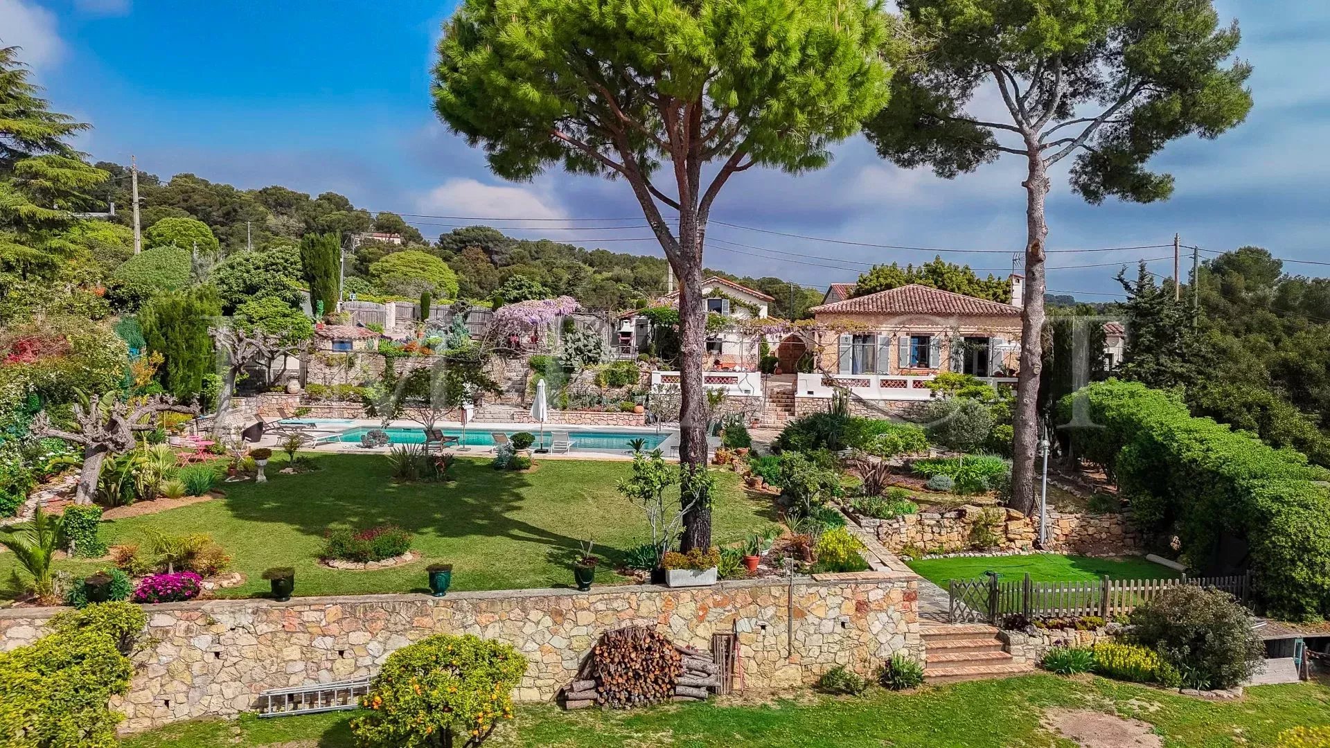 Le terrain de près de 2 750 m² est aménagé avec soin et planté d’essences méditerranéennes. Il comprend plusieurs terrasses ainsi qu’une piscine de 12 x 6 mètres exposée plein Sud.