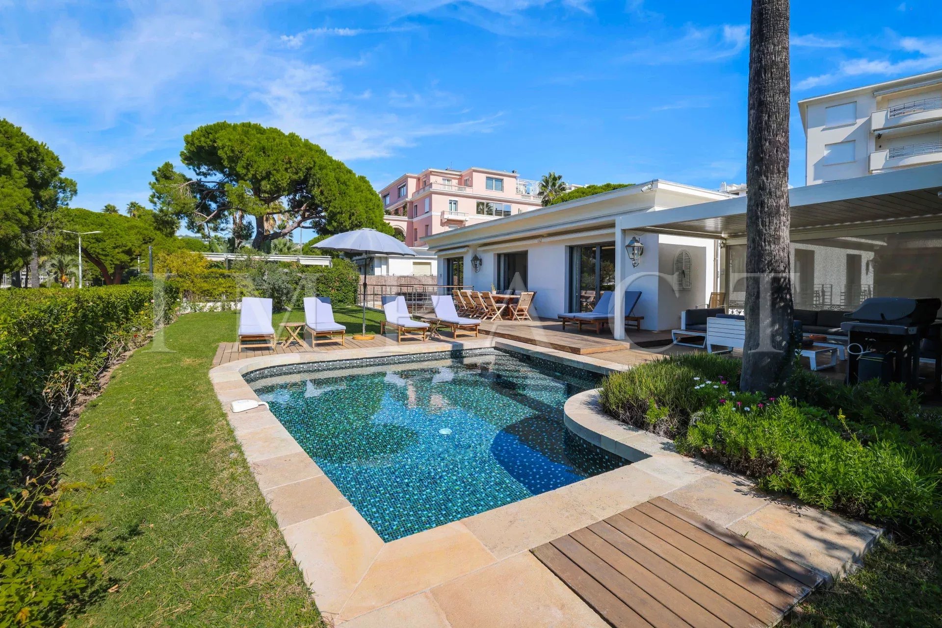 Villa rénovée de 350m², 5 chambres, salle de sport, piscine, située sur la Croisette, vue mer et Port Canto.