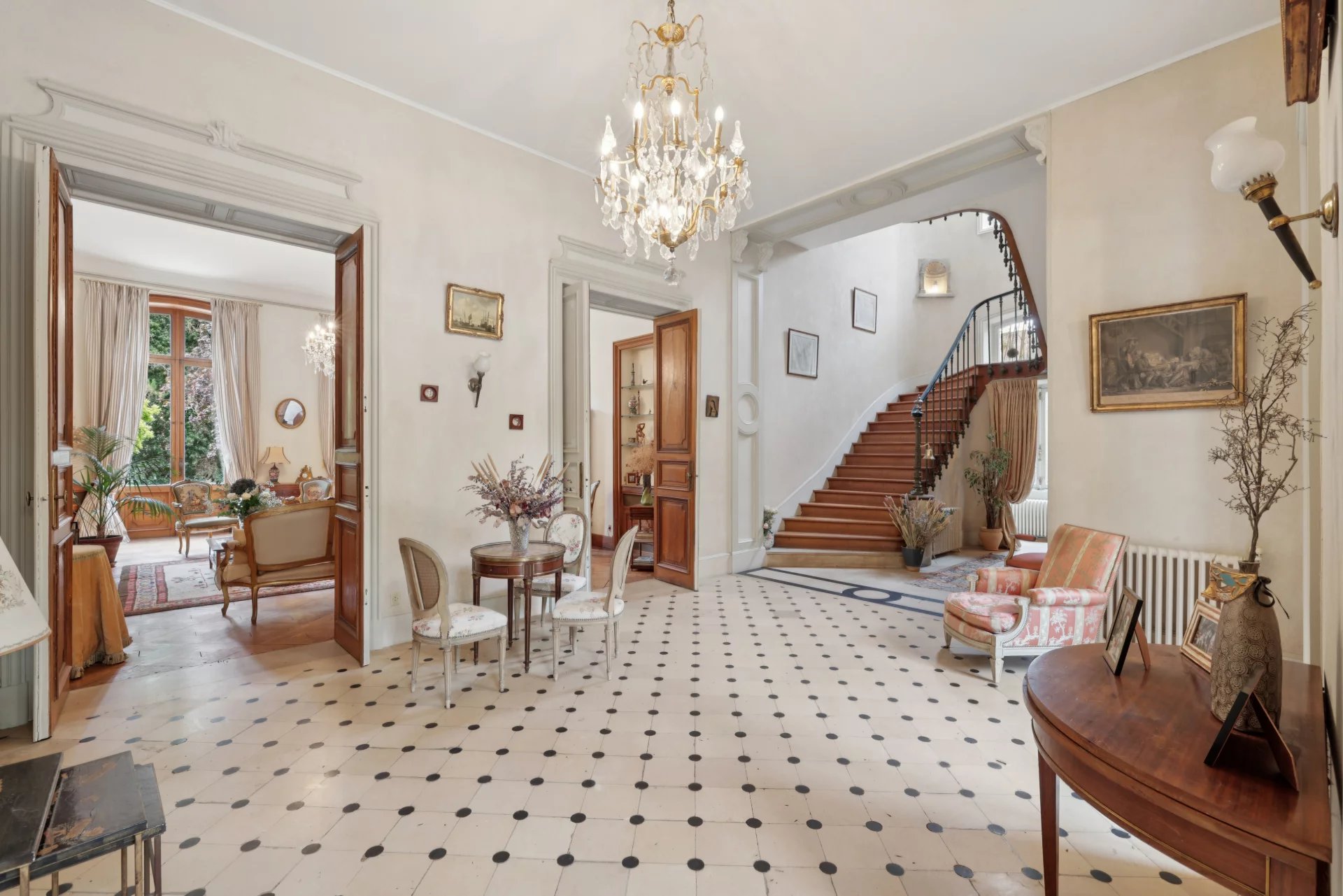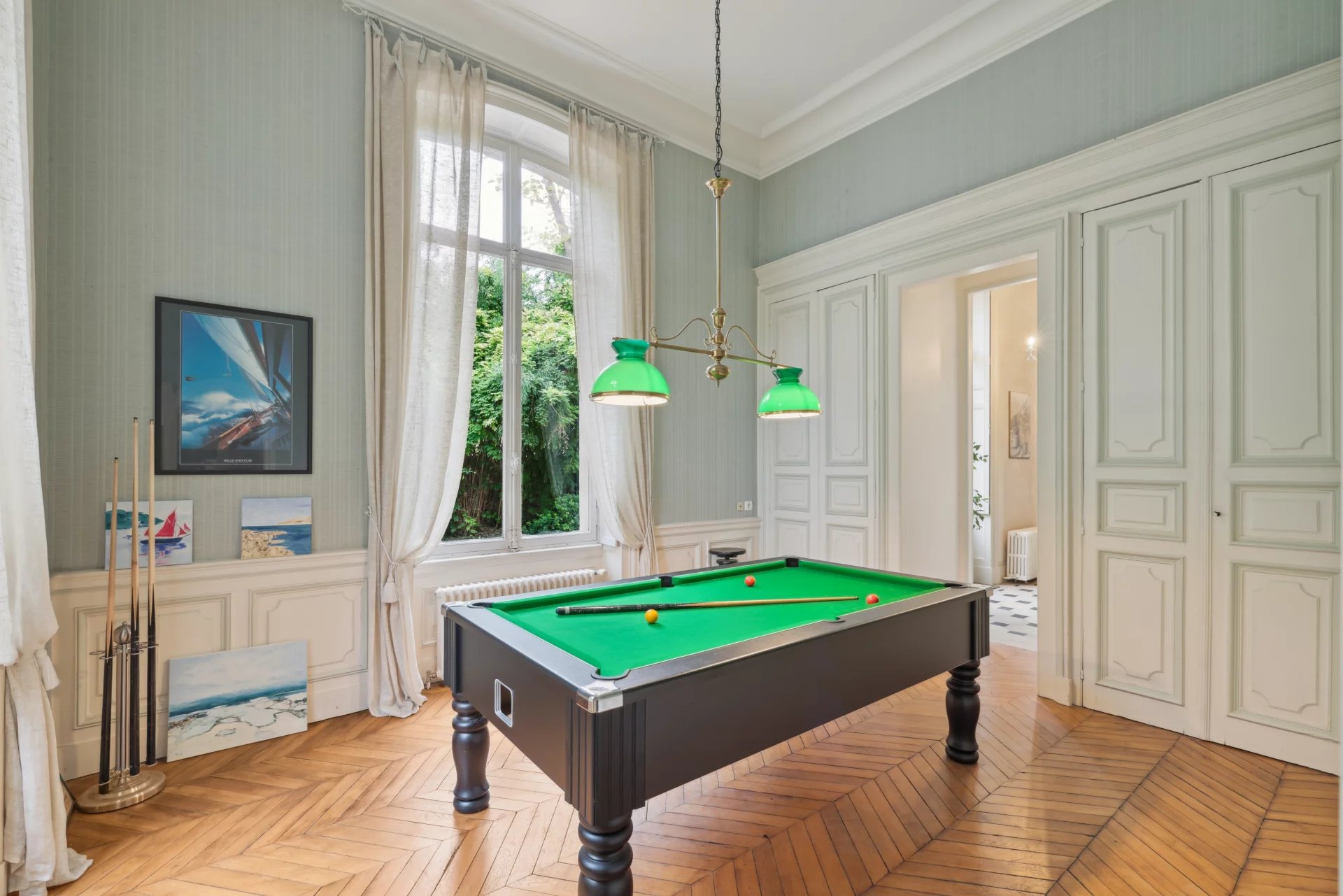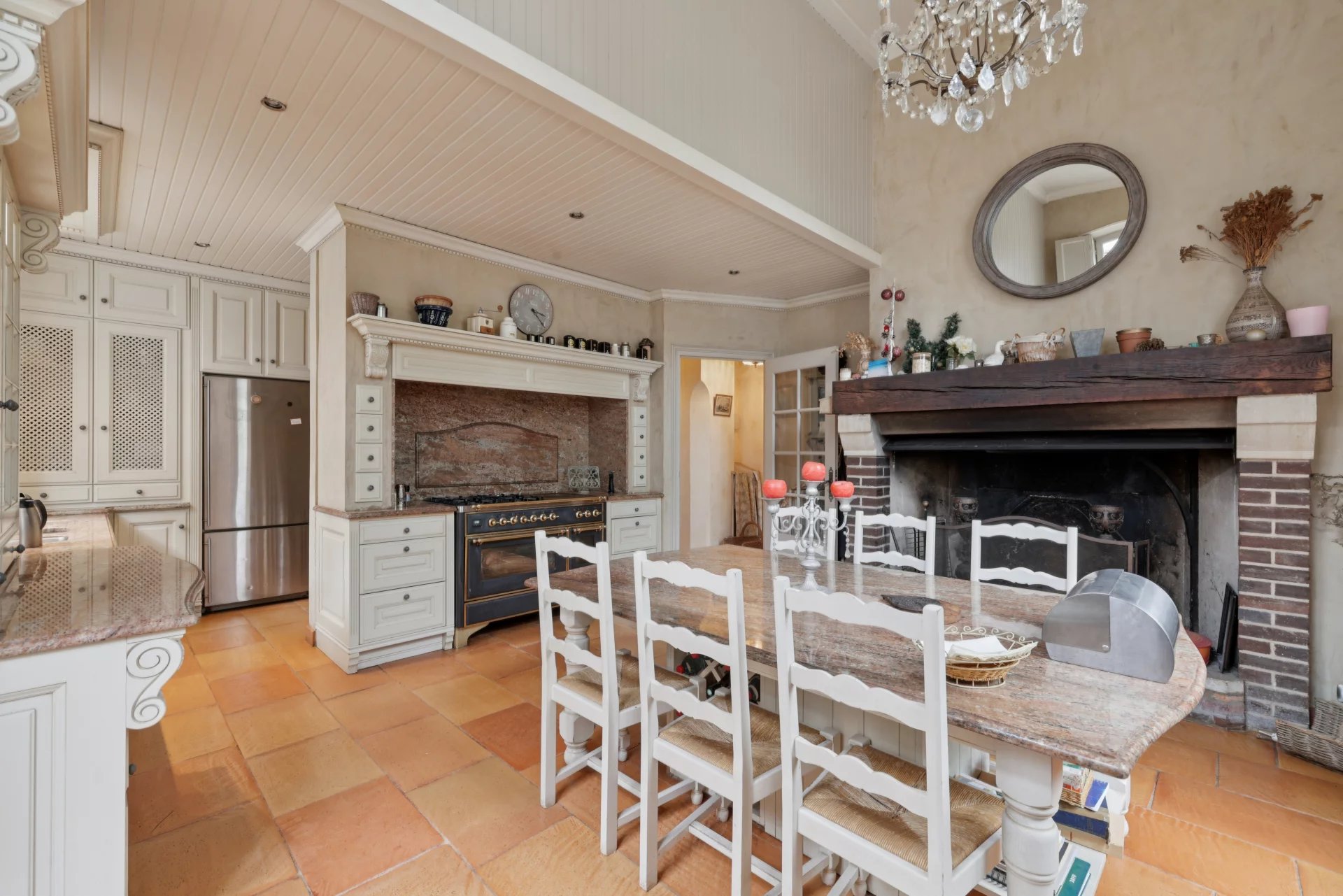 Rez-de-chaussée : vaste hall d’entrée, salon et salle à manger avec cheminée, cuisine familiale avec cheminée, bureaux salle de billard et toilettes. Accès direct à une grande terrasse sur jardin.