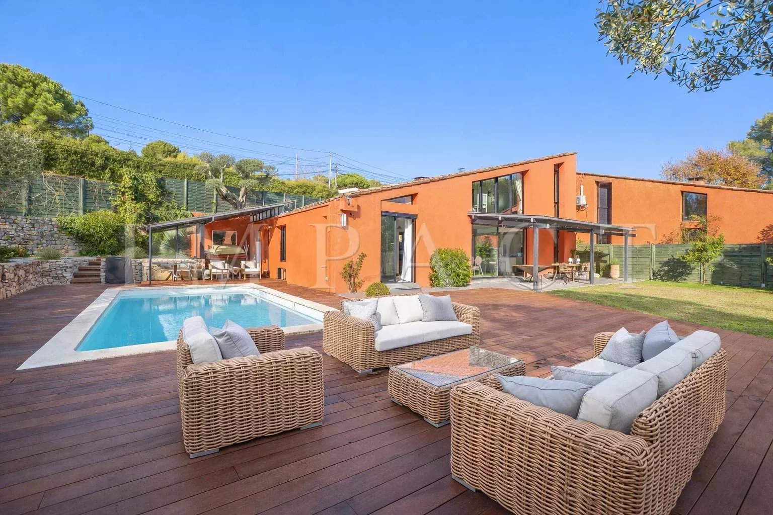 En co-exclusivité, villa discrètement mitoyenne, composée de : entrée, vaste pièce de vie baignée de lumière, 2 chambres en suites et 1 master à l'étage avec dressing et bureau.