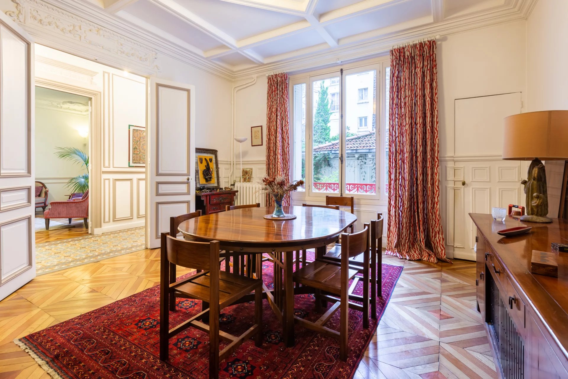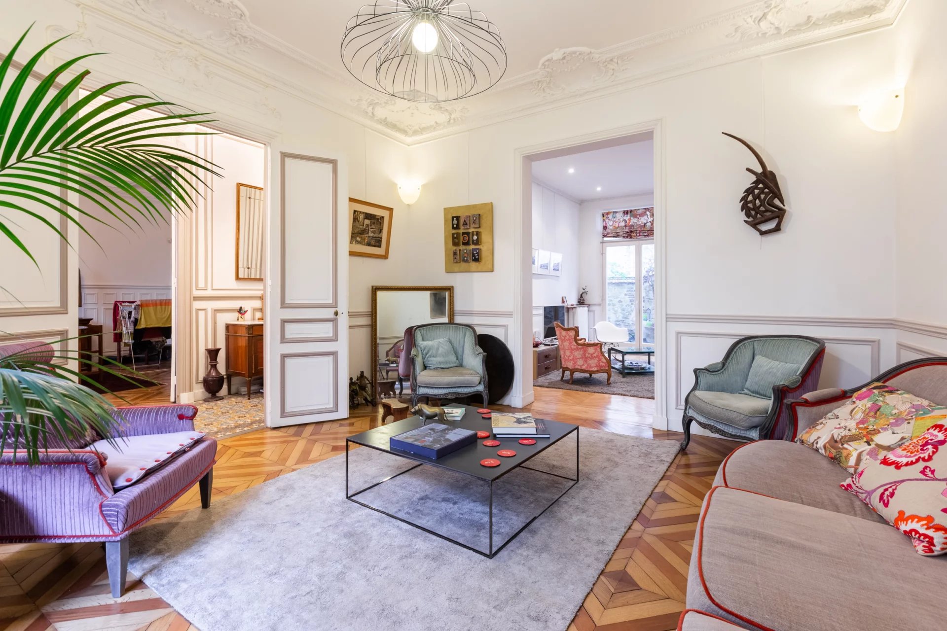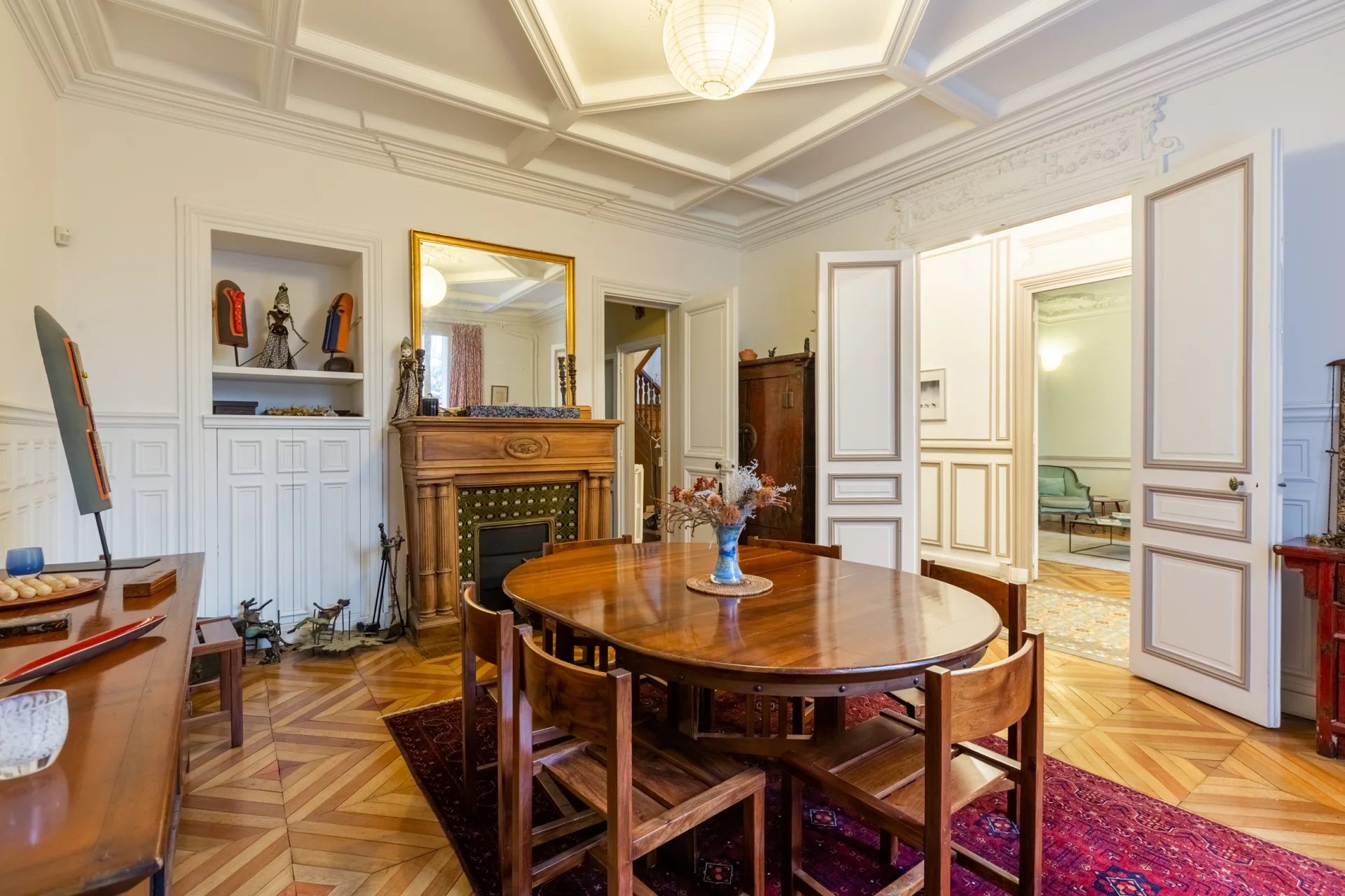 Dans une rue portant le nom d’un illustre physicien, dont les travaux furent consacrés à la lumière, se découvre, à l’abri des regards et sécurisée depuis la rue, une demeure familiale d’exception. Passé le seuil d’une large cour pavée, la maison se dévoile dans toute son élégance, développant 290,82 m² Carrez (370,23 m² au sol) et s’ouvrant sur un jardin intimiste de 95 m². Dès l’entrée, l’escalier central donne le ton et mène vers de généreux espaces de réception : un vaste double séjour traversant, baigné de clarté, où la hauteur sous plafond, les moulures délicates et la cheminée d’époque dialoguent avec un patio de 19 m² qui prolonge la pièce à vivre. Une salle à manger conviviale, une cuisine dînatoire spacieuse et des toilettes invités complètent ce niveau.